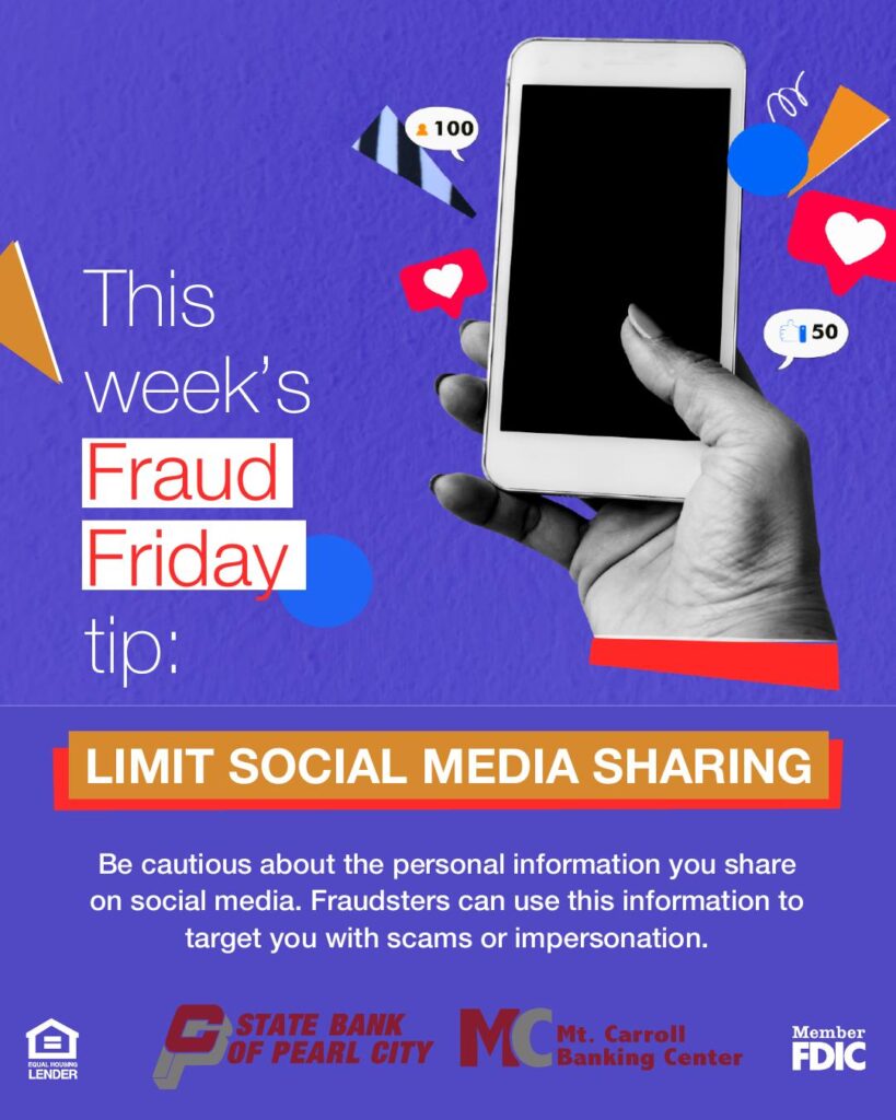 This week’s Fraud Friday tip emphasizes the importance of limiting social media sharing to protect your personal information. Stay vigilant and prioritize your privacy.